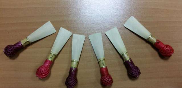 Он состоит из нескольких частей, это раструб, большое и малое колено и сапог. Сапог – это самая нижняя часть с двумя отверстиями, куда вставляются колена, а на большое колено надевается раструб. Ещё у фагота есть две штучки, это изогнутая металлическая трубка, которая называется эс, и трость. Эс по форме похож на букву S, поэтому он так и называется. Хотя по-английски он называется bocal. Он вставляется в малое колено и на него надевается трость. Трость – это две связанные пластинки из камыша. Это очень важная часть, потому что именно в ней формируется звук, который потом усиливается всем инструментом. Это такой расходный материал, как смычок у скрипки. Только если на скрипке ещё можно играть без смычка, то фагот без трости звучать вообще не будет. Вот так они выглядят вблизи: